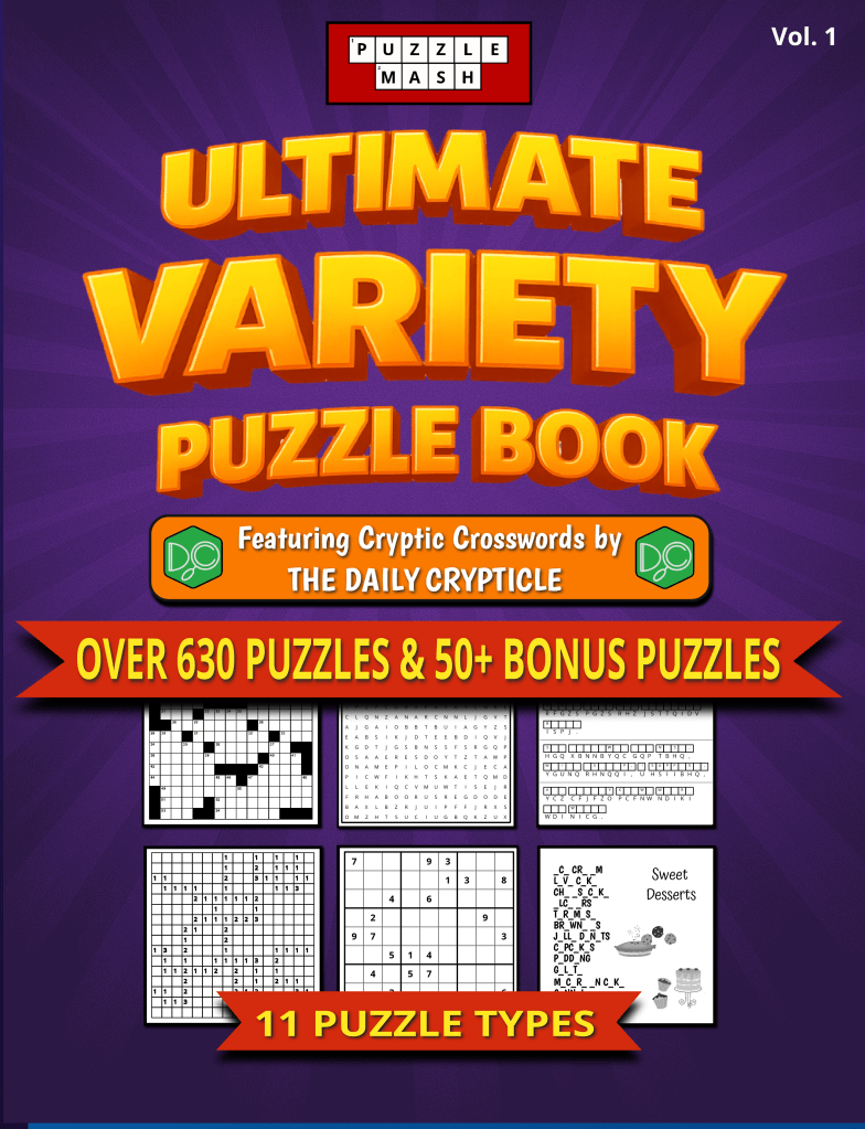 Our new Ultimate Variety Puzzlebook just debuted at #1 in “Cryptic Puzzles” on Amazon! This is not your average puzzle book! Over 300 puzzles featuring Cryptic Crosswords by the Daily Crypticle, NYT Style & Free Form Crosswords, Word Search, Sudoku, Cryptograms, Nonograms, Word Scramble, Mine Finder, Missing Vowel, Trivia, Fun Quotes & more.